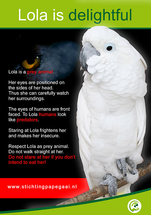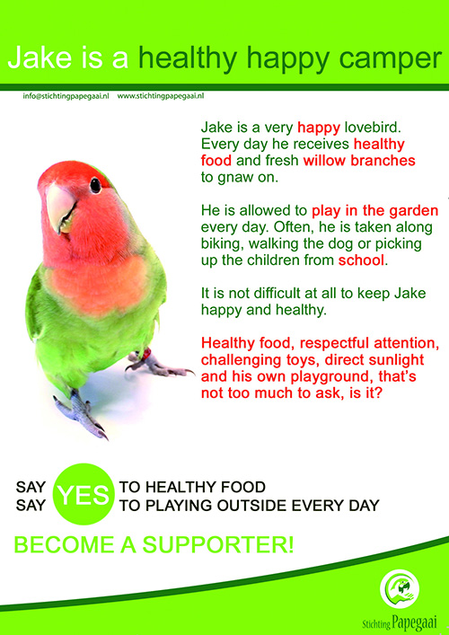 Author: Drs. Jan Hooimeijer,Bird Vet, Parrots behaviourist Clinic for Birds, Meppel Email: info@kliniekvoorvogels.nl Webite: www.kliniekvoorvogels.nl When it comes to the welfare of parrots and parakeets behaviour plays an important role. Known behavioural problems are: anxiety/uncertainty, lack of self confidence, feather picking, self mutilation, screaming, biting/territorial behaviour, 'destructive' behaviour sexual behaviour. Undesirable behaviour Undesirable behaviour is generally normal parrot behaviour. Under abnormal circumstances, normal and natural behaviour can become deviant behaviour and evolve into behavioural problems. Undesirable behaviour is often a sign that the bird has problems with the situation in which it is held and the way it is cared for. It usually indicates that the bird does not know where he/she stands. It is often comparable to the behaviour of children in a classroom with a teacher who cannot keep order. Children who have no respect for the teacher show problematic behaviour. Near this teacher the way the children behave is normal. Consequences of undesirable behaviour The consequence of undesirable behaviour may ultimately be that the bird is taken to a shelter for parrots or sold. A sad circumstance considering that a parrot can be a lifelong companion with a place within a family. Ignorance of the owner In general owners of parrots/parakeets are insufficiently informed about the responsibility of keeping these birds. There is insufficient realisation that these are not domesticated animals, that is to say that they are wild animals that are kept in captivity. The responsible keeping of wild animals in captivity requires knowledge about the background of the animal and expertise in handling of and caring for them. It is generally recognized that the responsibility of keeping a dog means the dog is raised so that the animal does not exhibit undesirable behaviour. Courses For 30 years now puppy training has been given in The Netherlands, over the course of 10 Saturdays, the owners are taught how to properly handle the dog. These courses are in the interest of the pet and in the interest of the owner. The course is actually not a puppy training but a course for the owner because the owner needs to learn how to deal with the dog. Dogs however are domesticated animals which have been kept by humans for thousands of years. Dogs are bred to be kept as pets and do not exist as a species in nature. In that sense it is very 'natural’ dogs are being kept as pets. Parrots/parakeets however are only recently being kept as companion animals and are as such non domesticated animals. It is only responsible to keep these animals if the owner has the necessary knowledge about the demands that these birds make in the areas of food, accommodation, care and education. Clinic for Birds expert in behaviour The Clinic for Birds has spent the past 20 years focused on the issue of behavioural problems and undesirable behaviour in parrots in captivity. Behaviour consultations are similar to a puppy training. The difference with a puppy training is that usually when parrots/parakeets are being taken in for counselling the majority of them already exhibit behavioural problems. Why a behaviour consultation? Behaviour consultations are largely intended to find out what errors/mistakes are being made in dealing with the birds. The behaviour consultation is primarily aimed at influencing and changing the behaviour of the owner. It is important that the owner learns to recognize that he/she is responsible for the undesirable behaviour. When the dog bites the neighbours children, everyone knows that the dog’s owner is responsible. The behaviour of the owner will have to be adjusted to prevent behavioural problems in the future. Such behavioural consultations are, in general, very intensive. Sometimes even confrontational because the owner must be made aware of their ignorance on the normal behaviour of a parrot/parakeet and the wrong ways of reacting to this. Expectations usually have to be adjusted. It is an illusion to think that a behavioural problem can be solved with a one-hour consultation. The causes and backgrounds of the problems can always be found during a behavioural consultation and there may be an impetus for further progress. To this end an information packet is provided with comments relating to the upbringing of a parrot/parakeet. Most of the time is spent reviewing and discussing the uncertainty, ignorance and mistakes of the owner in respect to keeping a parrot/parakeet. If the cause of the problem is known and recognized by the owner, therapy can be started. Time and perseverance It takes time and requires persistence from the owner to change their own behaviour and attitude. Each owner will have to realize that no one can learn how to drive within the space of a few hours. Nobody can play the piano after a few hours. Even properly painting of a door, takes practice, experience and time. Raising a dog takes many hours per day. The proper education of a parrot takes significantly less time per day as a parrot/parakeet is much more intelligent than a dog. A behavioural consultation has the effect that the owner will start working on his/her own imperfections. Learning from professionals We can learn from the way professionals interact and work with animals/birds. People who train dogs to become guide or police dogs to do this in a professional manner. People who work with Orcas do this professionally. People who work with parrots in a parrot show, are professionally involved. The dogs, parrots and Orcas have a strong bond with the trainers based on mutual respect and trust. That's what everyone should aspire. Owners of parrots and parakeets can learn from those who professionally work with animals. It is important that the attitude and approach towards the animal is clear. It is the difference between the teacher that can and a teacher that cannot keep order in the c